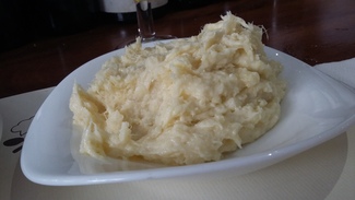 Me han gustado sus albóndigas. Prietas y de sabor agradable, buen especiado. Pero no las esperaba con ese emplatado engañoso. Te las sirven en mitades, con patatas a lo pobre y ajetes por encima. Con todo y con eso, sobra plato, puesto que no pasa en realidad de cuatro unidades.
