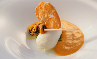 Vieiras, "calçots" escabechados, avellanas y trufa