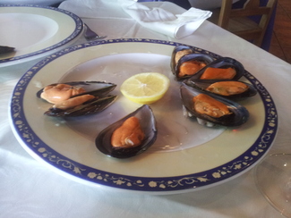 Comenzamos con unos mejillones de un gran calibre, pero una textura y sabor espectaculares ¡que no había probado en mi vida!. Es más, como no están en carta, el camarero sonrió cuando se los pedimos. Y luego Fernando se nos acercó a preguntar qué tal estaban y nos sonrió de forma cómplice como diciendo "os lo han chivado, jejejeje" (gracias Kintiman y Alberto!!!!!)