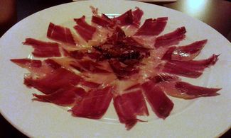 Me apetecía un poco de jamón así que en vez de la paleta que había pedido me dice que mejor un poco de jamón-jamón. Cuando ha llegado la cuenta me he dado cuenta del porqué. 9 euros la paletilla y 20 euros la ración de jamón. Prefiero no echar la cuenta de a como hemos pagado el kilo. Rico está, nos ha “jodido” pero un pelín pasado de precio. Afortunadamente viene acompañado de un pan tostado untado de tomate.