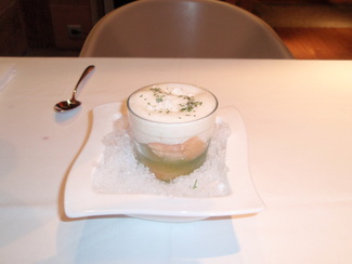 Una especie de espuma con crema de hongos muy rico, de esos que te comerías otro sin pensarlo, sabroso. Con unos trozos de pan tostado muy apetecibles.