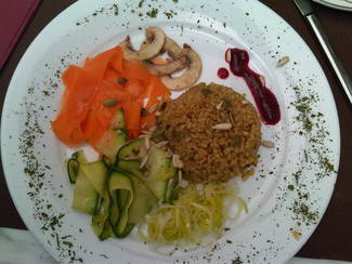 - Ensalada de cus cus y queso fresco, compuesta por cus cus integral biológico, zanahoria, lechuga, queso fresco, aceituna marcida de Aragón y salsa de hierbabuena. Muy rico! Ración generosa, correcta presentación y buena combinación de sabor y de color (adjunto foto).
