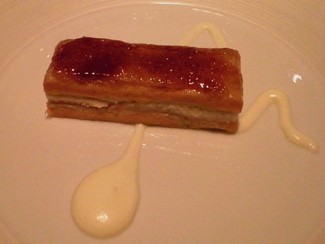 el caldo de calamarcitos con su crujiente y ravioli de tinta fue sustituido por Crocante de manzana verde, anguila y foie