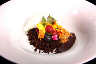El chocolate es un plato para mejorar, ya que siendo amante del cacao, quitaría el crujiente de arroz y pondría más énfasis en la explosión del cremoso (no apto para chocoholics), para que el chocolate negro sea el protagonista, corte el fin de los platos en mesa y maride con algo con más potencia que el moscatel, como por ejemplo un Fondillon o quizá un Marsala, y también un tinto dulce.