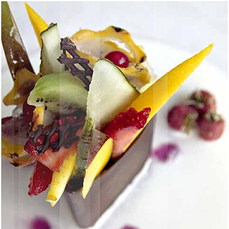 no podia faltar las texturas de chocolate, plato preparado en mesa por la chef, pastelera.