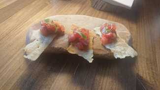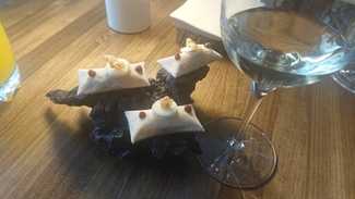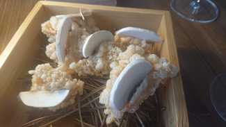 El primer aperitivo es muy representativo de lo que hacen y de donde están, cogen la corteza del torrezno, la secan, trituran y la vuelven a juntar, queda como un papel, la fríen para que coja volumen, con la carne del torrezno, hacen una crema, que usan para pegar las láminas de champiñón, finas y crudas, que pegan a la parte de la corteza, original deconstrucción, que aúna dos productos típicos de Soria.