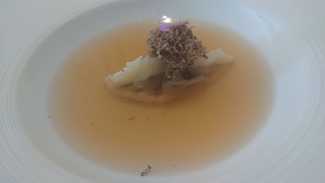 Corazón de endivia asada a baja temperatura con mantequilla de frutos secos, con un toque dulce, trufa de verano por encima, hoja de hierba melisa y se añade la sopa, una infusión de cebolla asada de Fuentes, muy sutil.