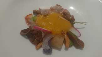 - Encurtidos y escabeches, un plato vistoso donde los haya, se presentaban varias setas escabechadas (boletus, níscalos, angula de monte, trompetas de la muerte...) combinadas con un muslito de codorniz, anguila ahumada y varios tipos de salsas, sabores y texturas.