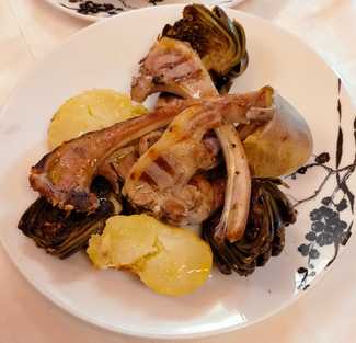 Xai amb patates al caliu i carxofex a la brasa
