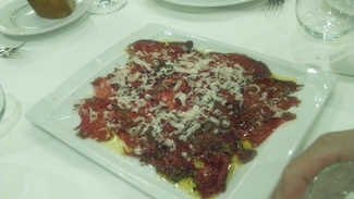 Carpaccio de buey y virutas de parmesano, buena carne vieja.