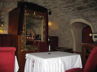 Restaurante subterráneo situado en una antigua bodega románica. Impresionante el local por su restauración y decoración, ambiente muy selecto y romántico. Cocina creativa de ínfluencias francesas. Empezamos con dos copas de vino blanco Muller Thurgau 2006 (12€). Optamos por el menú degustación (108€) compuesto por cinco platos y dos postres. Destacable la ensalada templada de langosta canadiense, los ravolis de ternera y espinacas con crema de cebolletas y el corte de cordero con crema de alcachofa y su riñón (ver foto). Carta de vinos extensa y con precios elevadísimos. Elegimos por recomendación del sumiller un vino local, Saint Laurent Springer 2005 (91€). Finalizamos con café Nespresso (5,5€). Invitación de licores. Posibilidad de reservar por Internet la mesa deseada.