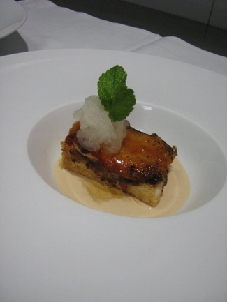 El Impromptu Sauvignon Blanc 2006 compensaba las notas salinas de la Anchoa de Bota, refrescando y limpiando la boca. En difícil maridaje, instigamos a nuestro premiado Bassus Pinot Noir a verse las caras con el calamar relleno de conejo y setas (con su arroz): armonizaba mejor con la pieza de calamar relleno que con el arroz de base; ironías del destino premiado y cuasi-sacrificado, el Bassus Pinot Noir, a un tiempo; aun así, mantuvo bien el tipo. El cierre salado, en plato principal, nos esperaba el cochinillo, que hermanamos ahora con el Bassus Premium 2007, en buena lid. Notas tostadas, grasas, mantecosas, del pequeño cochino, armonizaron muy bien con la vainilla, las especias y la estructura del tinto. Como colofón, en el postre la pareja no podía ser más perfecta: torrijas y Dulce de Murviedro, y enlazando, el granizado del mismo vino servido.