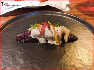 ─ Zanahoria morada con cola de Cigala. Extraordinaria. Francamente encuentro muy difícil que de un simple tubérculo se puedan conseguir sabores y matices tan estupendos. Si a eso añadimos la cola de cigala y una salsa que daba contexto y textura al plato, la combinación es inolvidable.