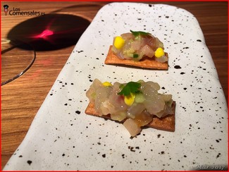 Snacks. Estuvieron compuestos por un bocado de trucha con una espuma de horchata y eneldo; el otro snack era una mini tosta sobre la que había un tataki de corvina. Mejor la corvina a mi gusto.