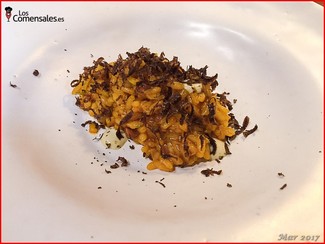 ─ Pato Azulon con pera + arroz de sus muslos. Excelente. Este plato lo sirven en dos vuelcos, el primero es un plato de arroz hecho con los huesos del pato (maravilloso) y el segundo vuelco unos trozos del magret del mismo animal de carne roja intensa y potente sabor ya que nos dijeron era de caza y no de granja. Hacer notar en este plato que nos ofrecieron compartir el arroz entre los dos comensales, de forma que fuéramos tomando todos los platos al mismo tiempo. Estupendo detalle y servicio.