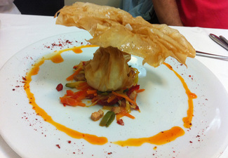 • Huevo crujiente “Les Maries”. Aires de modernidad entraron en nuestra mesa con este huevo, que llevaba un gran sombrero tipo hongo de pasta filo y bajo el, el huevo envuelto en la misma pasta con trocitos de calabacín y zanahoria al dente. Había que destrozar la creación y al llevarlo a la boca, la pasta, churruscadita, daba la sensación de que eran puntillas de un huevo frito. Puntazo los escasos trocitos de las mencionadas verduras, que le daban chispa al bocado con esa textura casi crujiente. A mi gusto, el huevo poché, demasiado hecho.