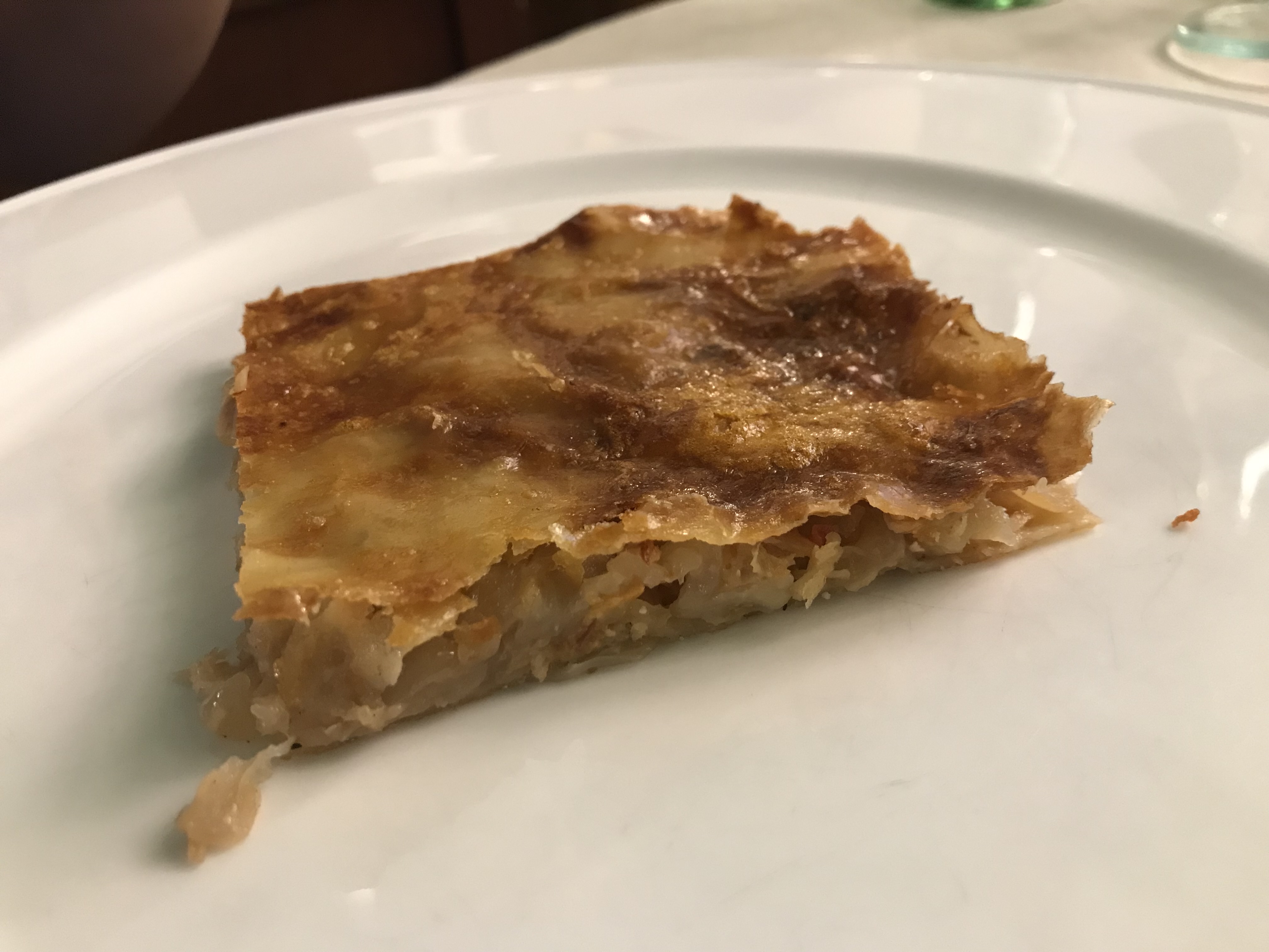Luego dos trozos de fina empanadilla de pescado y mariscos, sabrosísima, 6€.