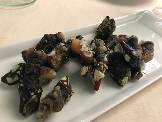 Comenzamos por una yodada y carnosa ostra, para seguidamente probar unos berberechos al vapor de punto corto y perfecto. Sabrosísimos.