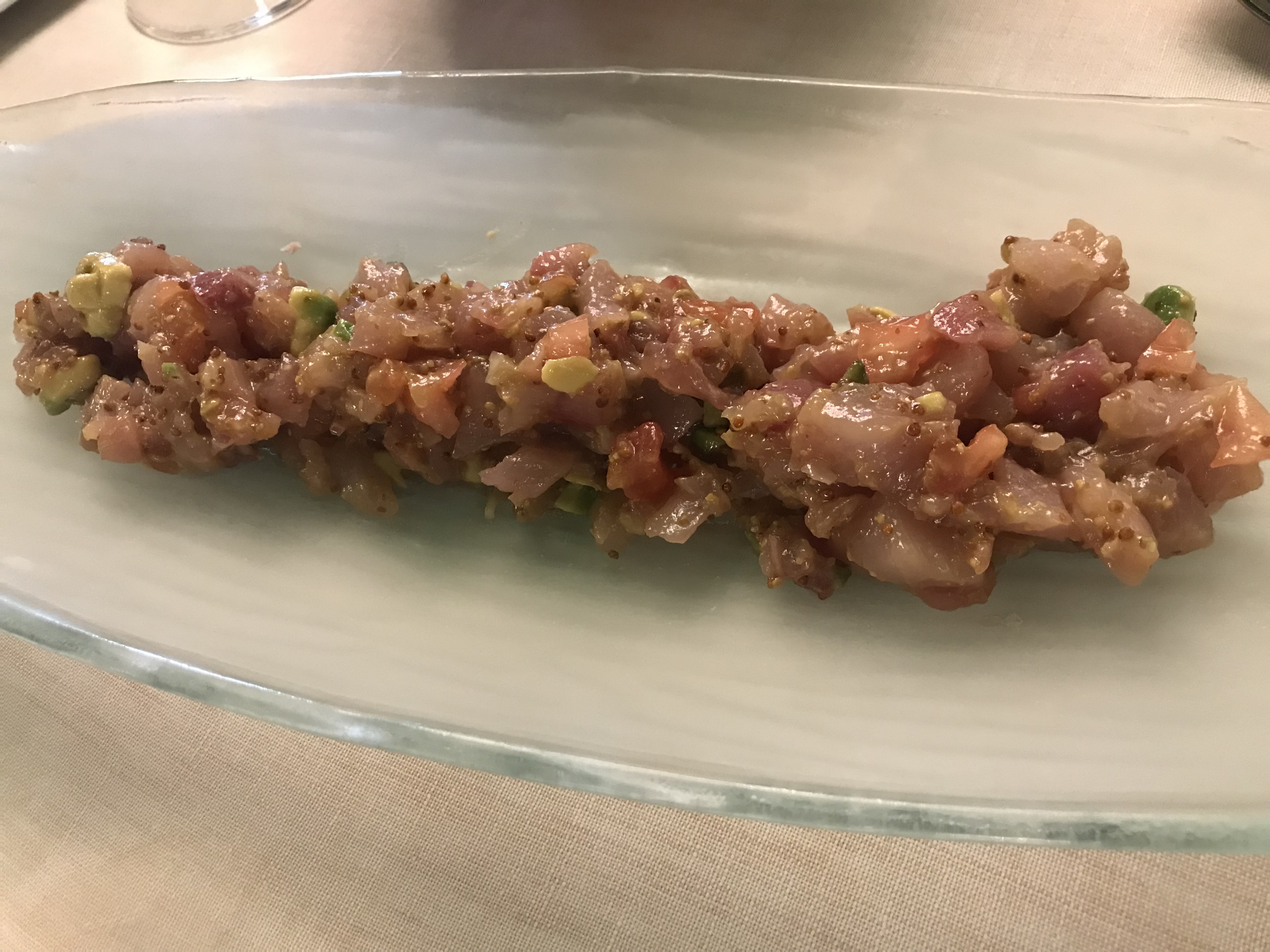Tartar de bonito de Burela acompañado de pequeñas rebanadas de pan tostado "Chapeau". Riquísimo.
