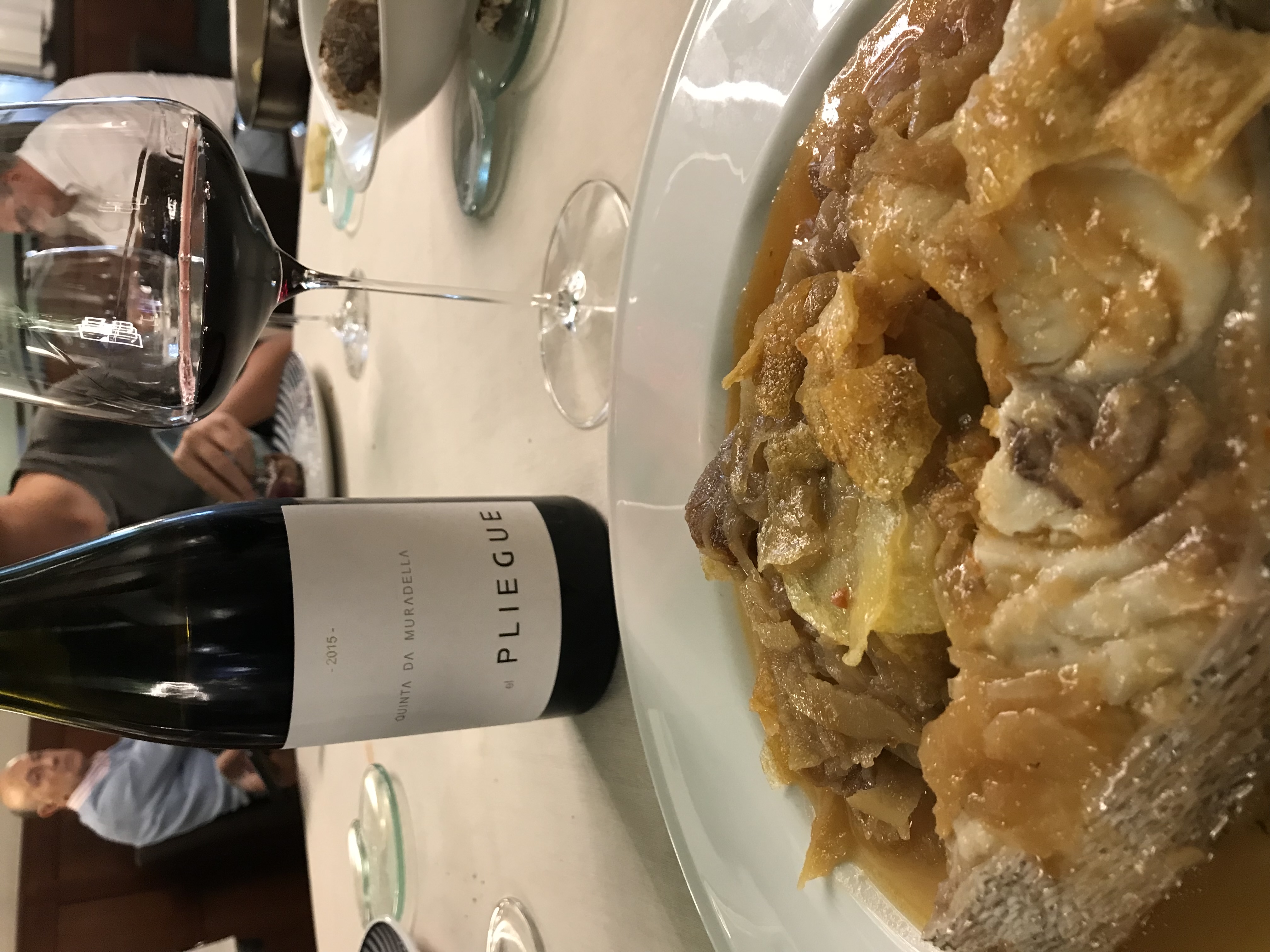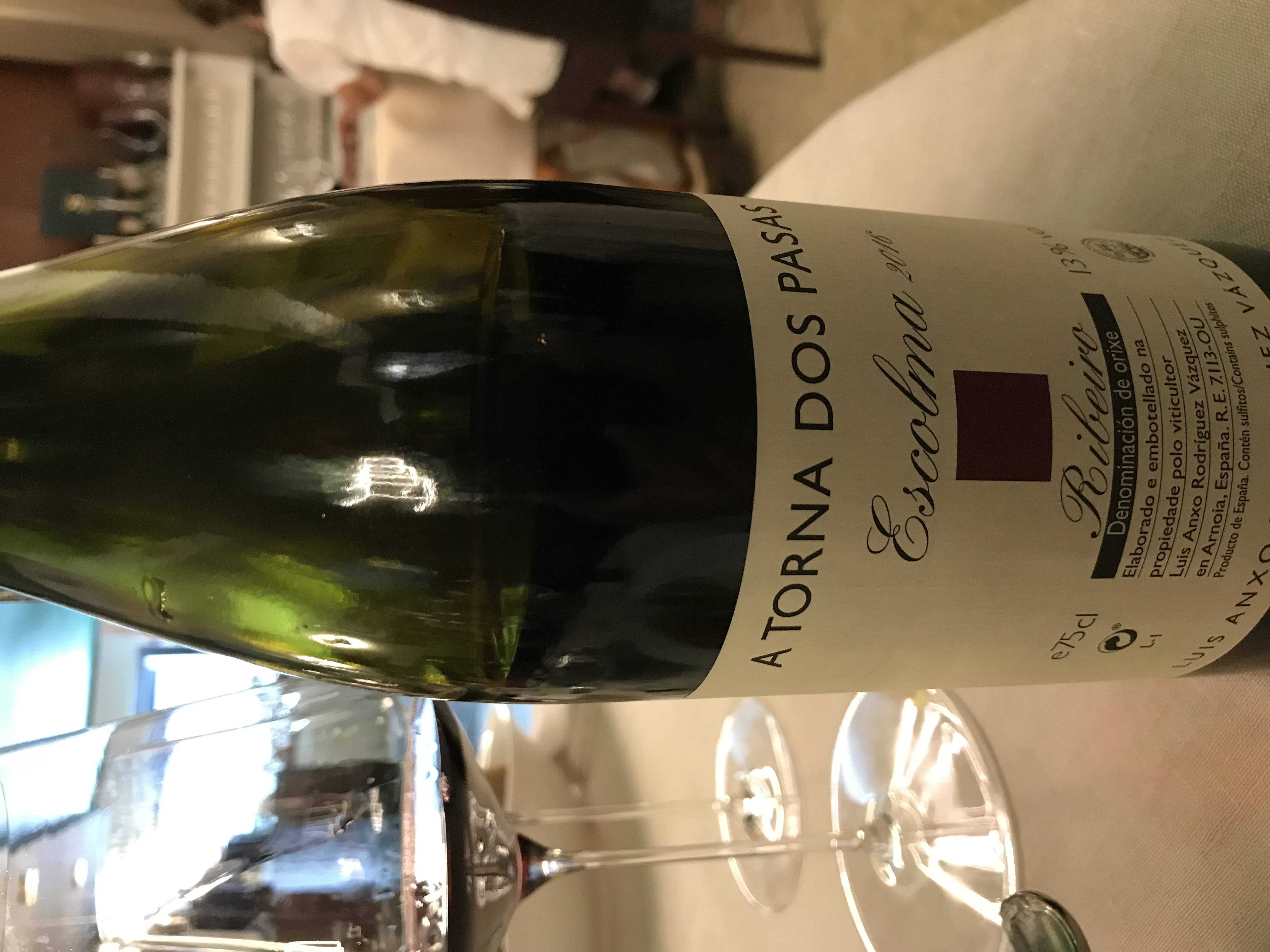 Para beber tomamos una botella grande agua con gas y una botella de vino blanco crianza Branco dos brancos Vaigadares 2017DO Rias Baixas. Pazo de Almuiña Adegas Galegas (Precursores de la fermentacion del albariño en barricas de roble en 1995). Cepajes 85 %Albariño, 10%Treixadura,5% Loureiro, "La fermentación comienza en depositos de acero inoxidable y termina en barricas de roble francés y americano de 225 l. Las diferentes varietales fermentan por separado. La crianza es de 6 meses aprox. en barricas de roble francés y americano con batonnage 2 veces por semana." Color amarillo dorado. Vino muy equilibrado, fresco y sabroso, se siente ligeramente la crianza, largo en boca. Me pareció interesante y me gustó