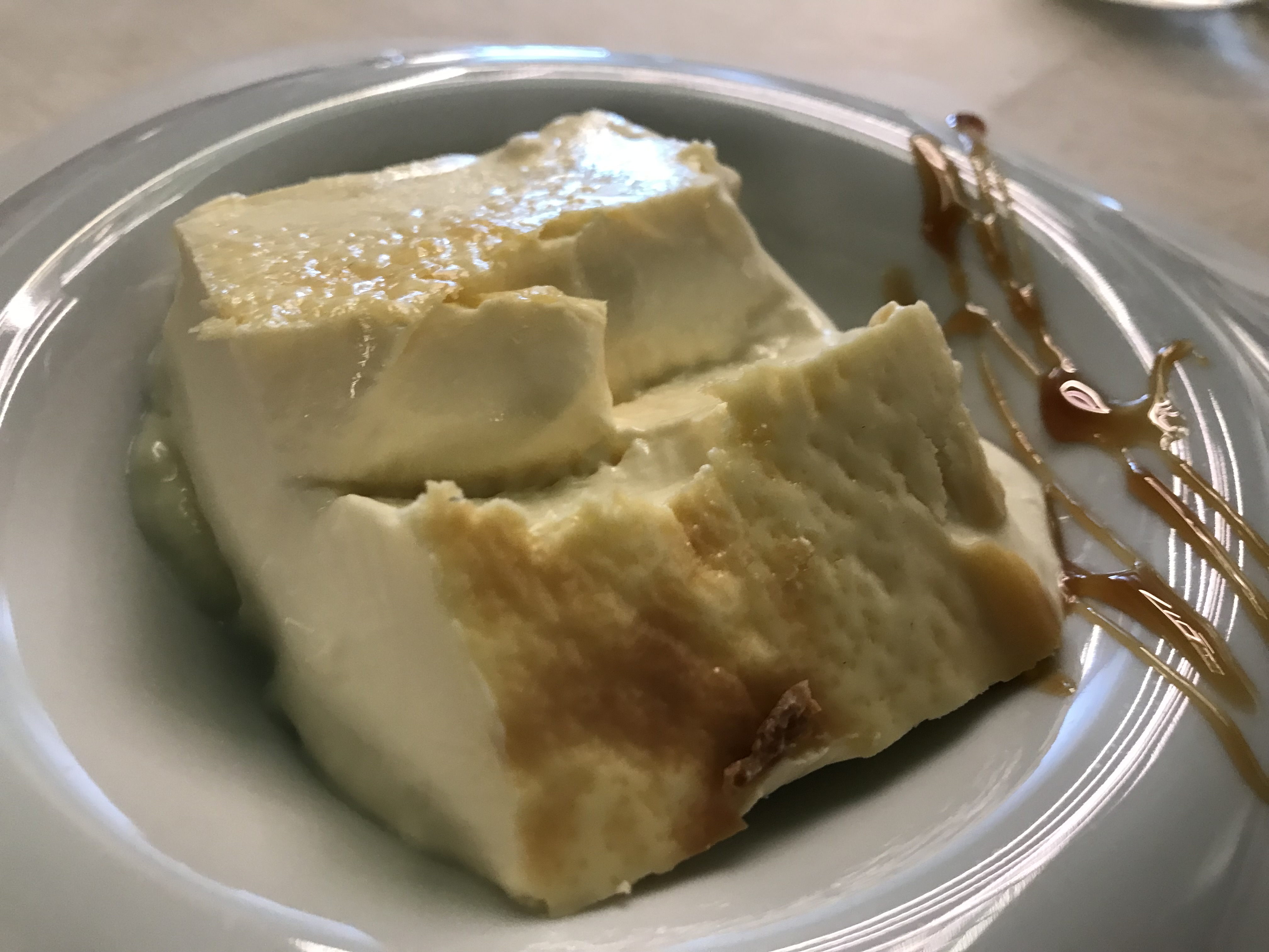 De postre una tarta de queso, esta muy buena, textura de flan, rico sabor.