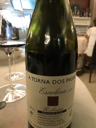 Para beber tomamos agua Km0 y una botella de vino blanco, la misma que tomamos en Yayo Daporta, pero algo mas joven, aunque la cosecha del 2019 fue excepcional. Cepas Vellas Albariño do Ferreiro 2019 DO Rias Baixas, Bodega Gerardo Mendez (Meaño). Cepages 100% Albariño. Viñas viejas de mas de 200 años. " Se deja en la cepa un 10% de la uva para que llegue al punto de la botrytis noble y la vendimia es totalmente manual. En bodega se despalilla y se realiza maceración pelicular en frio. Después se prensa la uva y el mosto fermenta en pie de cuba. Finalmente el vino reposa sobre sus propias lías finas en depósitos de acero inoxidable unos 12 meses." Vino muy elegante, denso, de largo recorrido, fresco, con muy buena acidez y muy equilibrado. Nos encantó como el del día anterior.