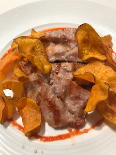 Comimos un menú. De aperitivo un carpaccio de presa ibérica. De primero unos boliches que son unas judías blancas de la zona con algún tropiezo y unas setas, unas eran trompetillas y las otras no recuerdo, buenísimos los dos. De segundo secreto con chips de boniato. Los postres espectaculares uno de helado con frutas del bosque y galleta y otro de tiramisú con apariencia de seta impresionante.