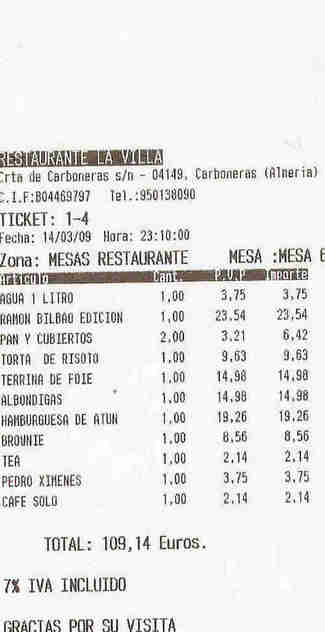 Ojo, lo precios son sin IVA, pan e cubierto para dos sale por 6.42 y una botella de Solan de Cabra "solo" 3.75!