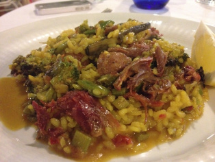 - 2 x Arroz de verduras con pato deshuesado y albóngigas: Dos platazos de arroz, ligeramente meloso y sabroso (no salado). Rico en verduras (judías verdes, brócoli y ceps) y abundante pechuga de pato y albondiguillas.