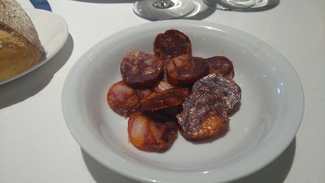 Tienen un par de menús además de la carta, pero ninguna tiene alubias, así que como lo que queremos es alubias de Tolosa, nos recomiendan picar algo de primero o ir directamente a la alabiada, como de aperitivo tenían un chorizo de guijuelo , Carrasco , que esta muy rico , pedimos por favor otro platito y directamente a la alubiada .