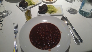 Te sacan en un plato la berza, con un punto al denté, crujiente y al lado dos buenos trozos de morcilla de Beasain , de la carnicería Olano que es una maravilla, cebolla, puerro, canela, sangre y una tripa fina, la mejor morcilla que he comido, luego en un bonito plato hondo las alubias, de un tamaño mas pequeño que la típica española , de color rojo y con su caldo , que parece chocolate a la taza , tanto en color como en textura , finas , bien cocidas , solo con agua y abundante aceite durante horas y después se sazona , mantequilla , en contraste con la crujiente berza y la maravillosa morcilla y por supuesto no podían faltar las guindillas de Ibarra .