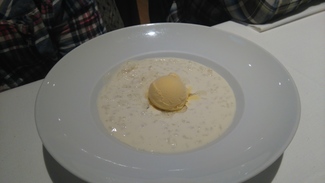 Otra cosa es el postre, pedimos dos, una torrija con natillas y helado y un arroz con leche de caserío y helado, también de vainilla a 7€+iva cada uno, y desde luego nada destacable ni de uno ni de otro, de hecho es la torrija mas sosa que me he llevado a la boca, esto si me parece caro.