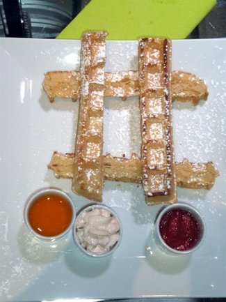 ¿Se puede comer bien en un concesionario?...la respuesta en Paris es SI. Es una opción original en plenos Campos Eliseos. Las mesas están colgadas de plataformas sobre los coches en exposición. Es L´Atelier de Renault. Pedimos unas cervezas y luego el Château La Gorce 2006 a un precio razonable (25 euros). De primeros unos tomates cherrys con bolitas de queso de mozarella sobre gazpacho, muy refrescante, y el tartar de salmon con trocitos de lechuga crujiente (jugoso y fresco). De platos principales el pato a la parrilla con vegetales (sabor intenso) y una pasta artesana salteada al wok con alcachofas y pimientos....bien aliñada con queso rallado. Los postres estuvieron bien, la tarta de queso con helado de frambuesas y -sobre todo- el gofre de la casa....con diferentes cremas para añadir. La comida muy bien...y de tanto mirar los cohes me enamoré del Zoé.....