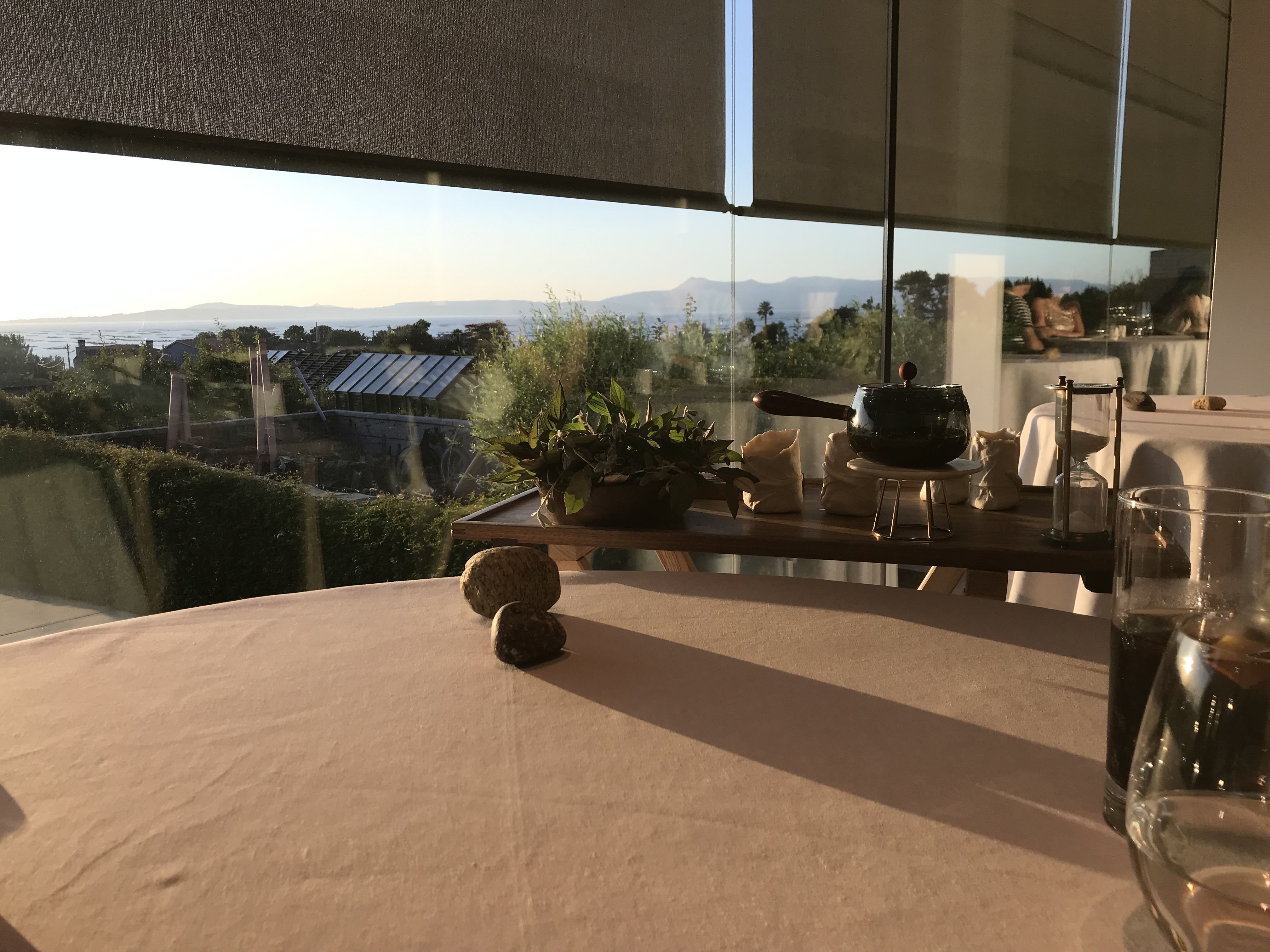 El restaurante se encuentra situado en la península de O Grove, en una ubicación privilegiada. El local es moderno, minimalista, muy funcional, el comedor principal situado en el primer piso está decorado con gusto, sus paredes de tonalidades blancas le confieren mucha luminosidad gracias a los grandes ventanales que cierran la sala hacia el exterior y a través de los cuales se divisa perfectamente la ria de Arousa. La cocina está a la vista. Deben haber unas diez mesas, perfectamente separadas las unas de las otras, muy bien vestidas, con buena vajilla, cubertería y copas de calidad(Riedel). El Servicio de sala es atento y profesional. El Servicio del vino, dirigido por el sumiller Eduardo Camiña también.