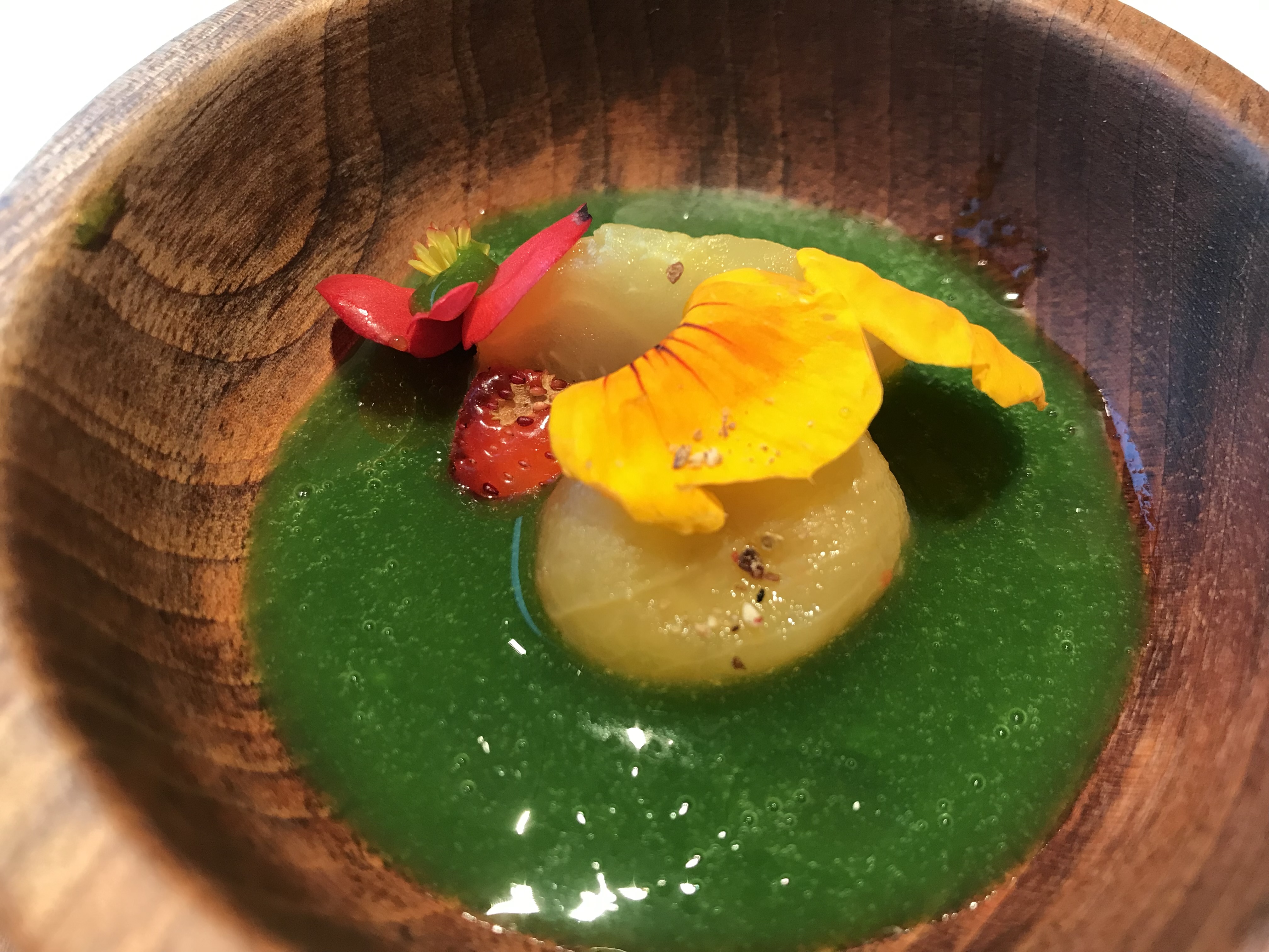 Sopa de trébol bravo, frambuesas del huerto, kefir y elaboración con nitrógeno de fresas.