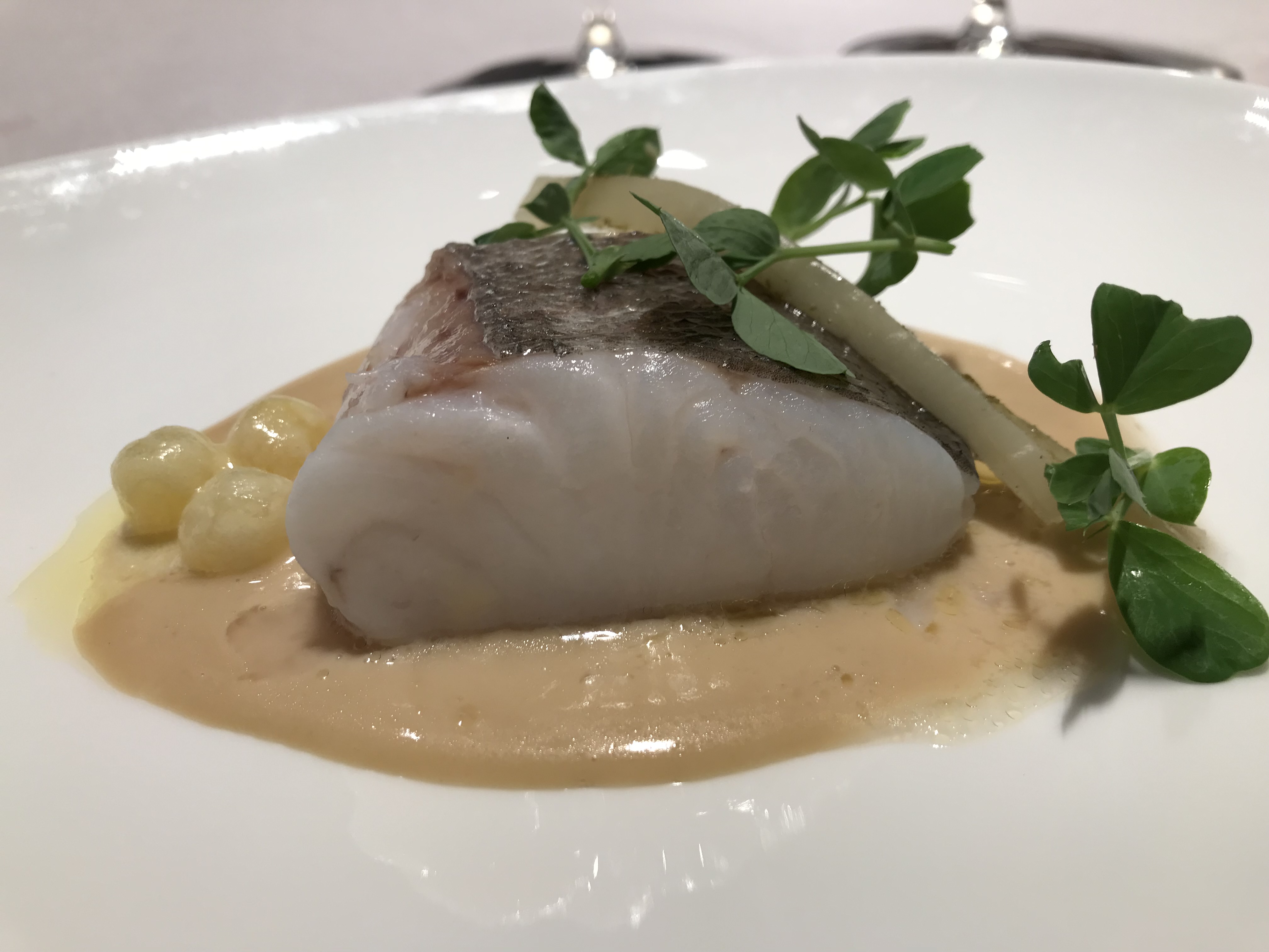 - Lubina con mantequilla de algas y calabacín. Un buen lomo de lubina al que, por supuesto, se le separaban perfectamente las lascas acompañada por una suave mantequilla y una sorpresa: percebes ya limpios. Una sutil crema de calabacín culminaba la obra de arte. Tremendo.