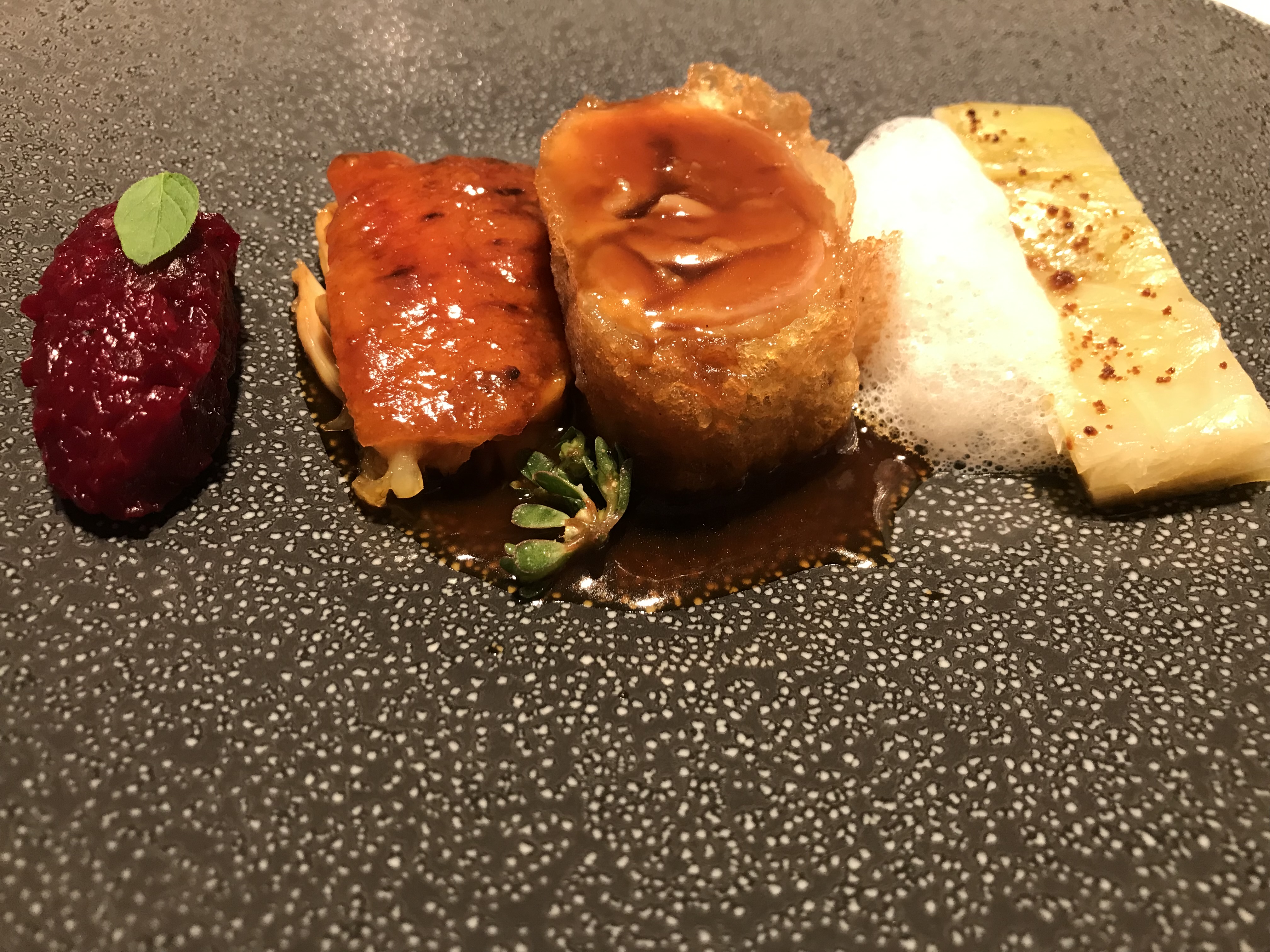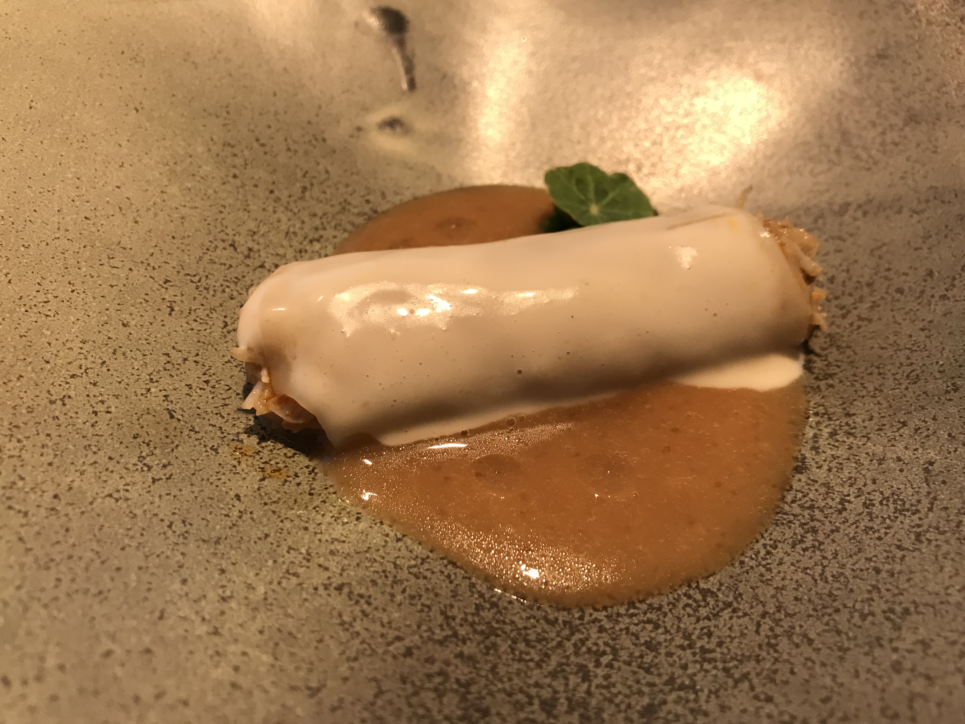 El canelón de buey de mar , es novedoso para mi y salino de casi finger, un bocado de dioses, con 2 salsas y tapado , además de los brotes crujientes exquisitos. Uno de mis favoritos.