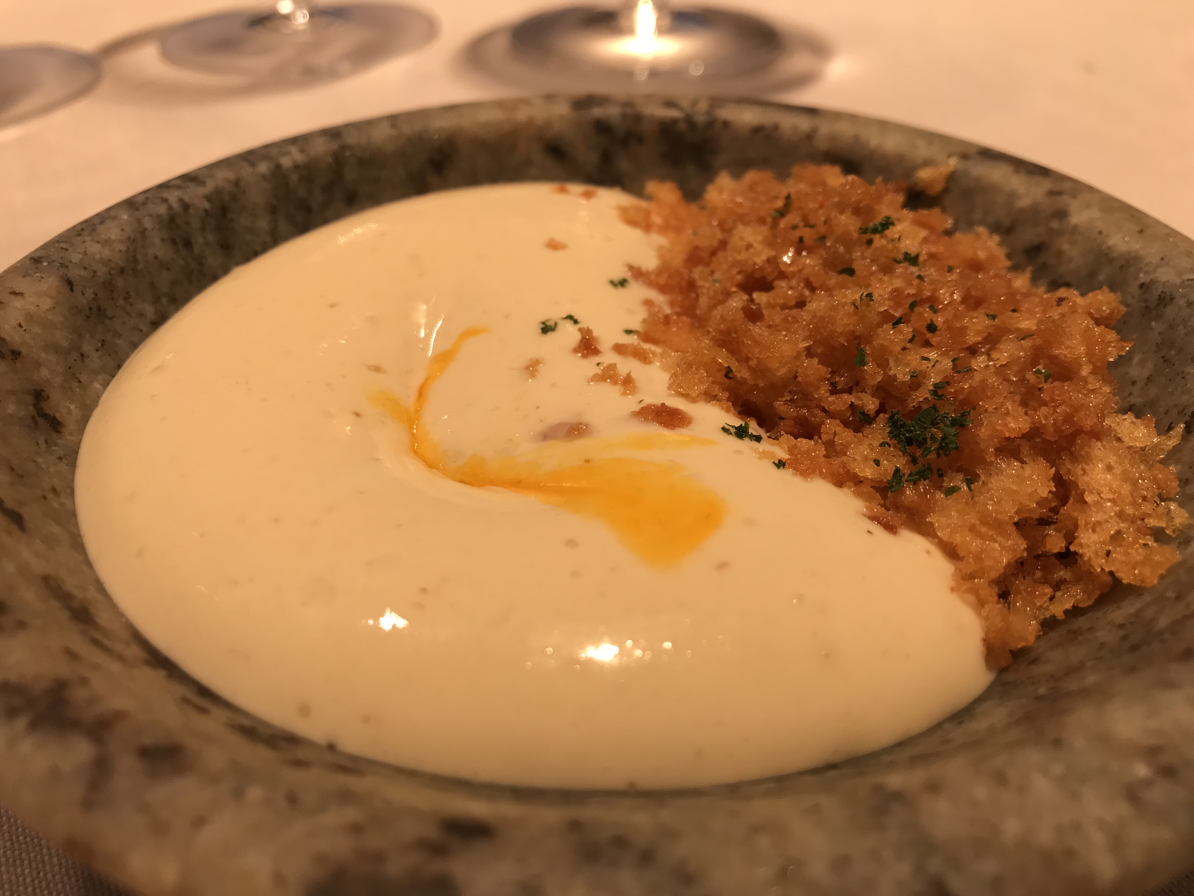 - Huevo a la carbonara de San Simón y migas de pan. Otro plato enorme. Huevo a baja temperatura con la carbonara de queso y migas crujientes acompañando.