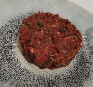 Buena ración de Steak Tartar con patatas fritas al Palo Cortado por 29€.