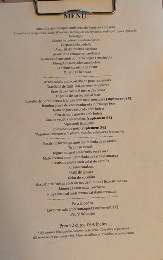 Recomiendo que en la primera visita pidáis unas “cocas torradas” con embutidos, (te lo sirven en una “fusta” (madera) para que cada cual se sirva el que la apetezca y cualquier plato de la cocina tradicional (Si es temporada de setas, no dudéis en pedirlas)