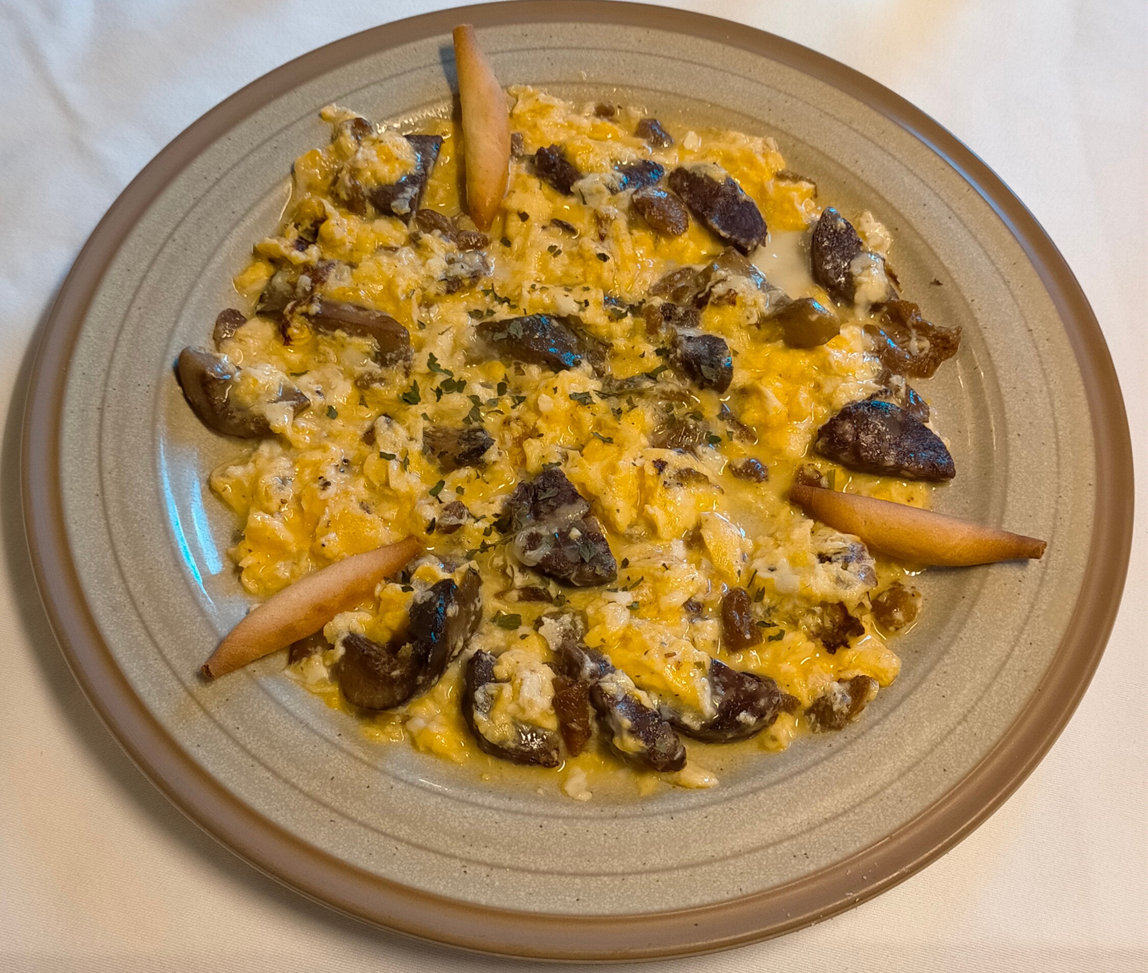 - Revuelto de huevos con butifarra negra y rebozuelos - Solo sabía a butifarra. Además, estaba soso. Desconozco el motivo de incluir los picos en el plato.