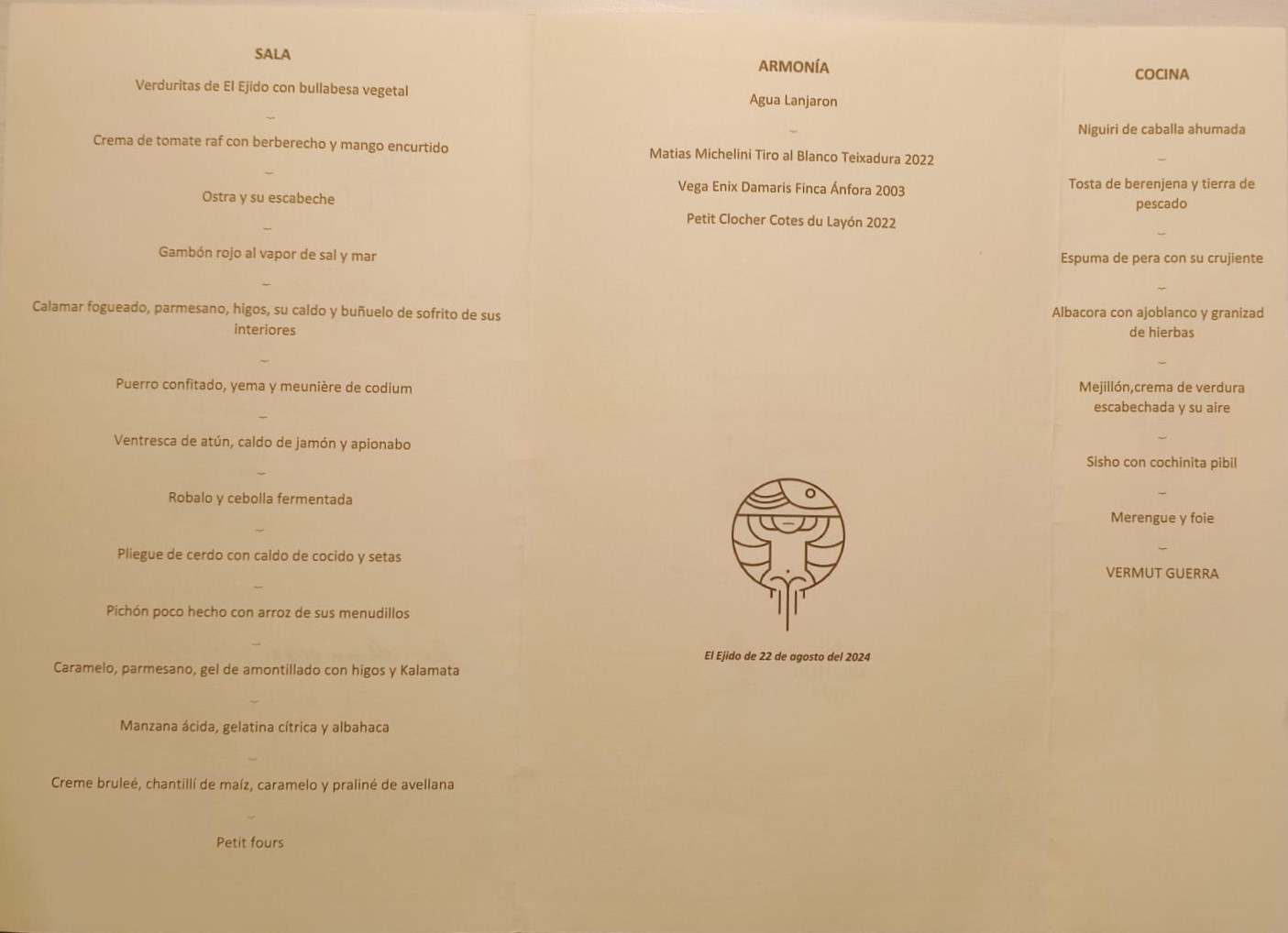 Cocina que se basa en el producto de los dos proveedores primordiales que aquí encontramos, la huerta que hay bajos los inmensos mares de plástico y los productos del Mediterráneo que dista un pocos kilómetros, con guiños a una modernidad bien entendida y sin estridencias, una cocina cuidada con sus puntos arriesgados, algunos más acertados que otros. Se ofrece la posibilidad de comer a la carta y por supuesto el menú degustación (68€), opción que finalmente fue la que preferimos y que consistió en: