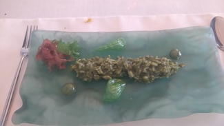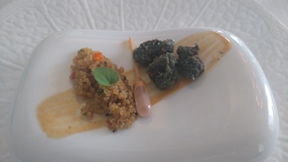 Palomitas de mar y migas de quínoa, acompañado de una emulsión de erizo de mar en pipeta , erizo rebozado , haciendo las formas de palomitas , algo falto de ese sabor potente que suele tener el erizo , me imagino que lo suavizaran , y con la emulsión regué la quínoa , rico .