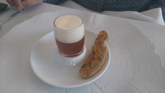 - Chupito de pez mantequilla y espárrago blanco. Original, recomiendan mezclar ambos componentes, y llevan razón, individualmente, la espuma de espárrago blanco esta muy bien conseguida, pero la parte el chupito de pez mantequilla aunque intenso de sabor, deja sensaciones en boca de grasa, al mezclar se equilibra el sabor y produce un muy buen resultado.