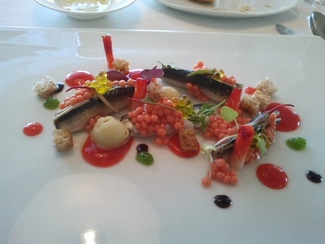 Sardinas marinadas con pan, tomate, aceitunas y fresas.