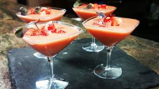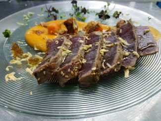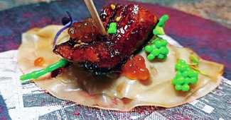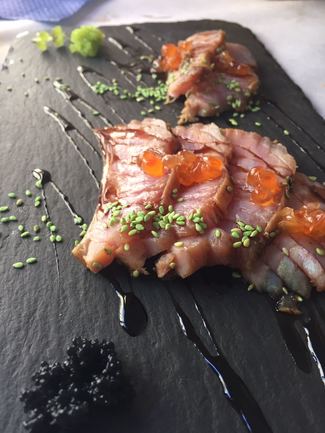 . ensalada templada de magret de pato a la brasa con mango (en helado), cherry, brotes, langostinos y vinagre de Oporto: bien conseguida aunque al verde le faltaba tersura (frescura).