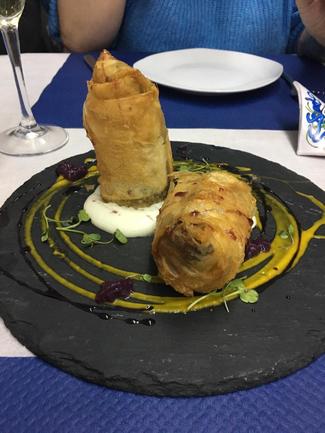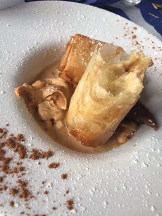 . apple strudel: en una presentación tan original como difícil de comer. Bien de sabor, amplia ración, buen punto de dulce y buena textura.
