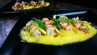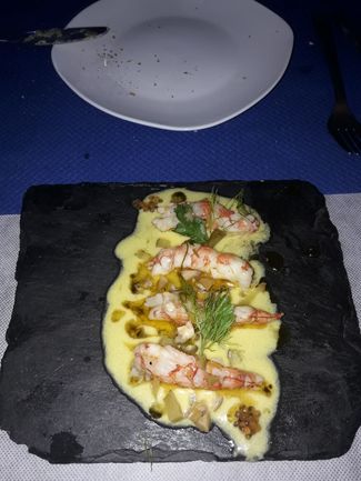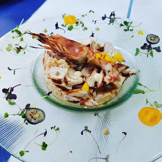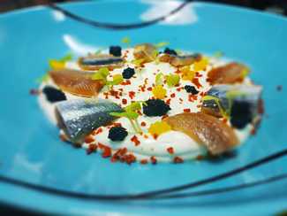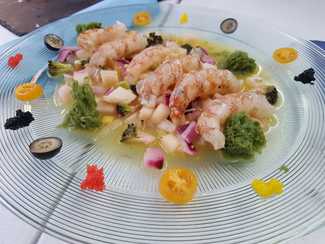 La misma sensación transmite su cocina que tiene una base en productos y sabores clásicos con una elaboración y presentación actualizada; la cocina es visible parcialmente desde la sala. Las mesas están vestidas con manteles de papel individuales, copas de vinos aceptables para el planteamiento del restaurante, las mismas se usan para agua; cambio de platos y cubiertos correcto; vajilla moderna aunque abusando un poco del color negro. Servicio amable, muy valenciano, con buena descripción de platos y recomendaciones; buena cadencia de llegada de platos aunque estábamos casi solos.