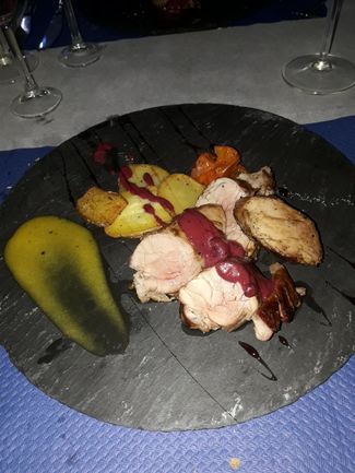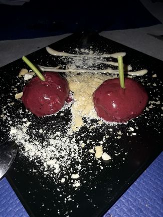 . dispone de 3 opciones por lo que decidimos probarlos todos de forma compartida y resultó que las raciones son amplias y compartibles. El primero (por orden establecido) fue, servido en un tarro de cristal, cremoso de yogurt con helado de vino tinto, ambos cumplen bien aunque el helado aparece un poco a trozos en lugar de ser un sorbete cremoso.