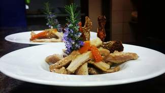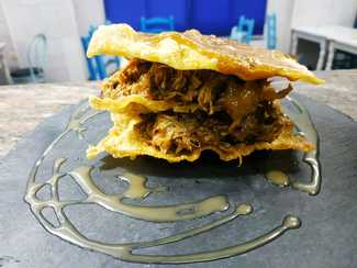 . jabalí en escabeche casero: servido en cazuela con la carne muy troceada y un escabeche potente.